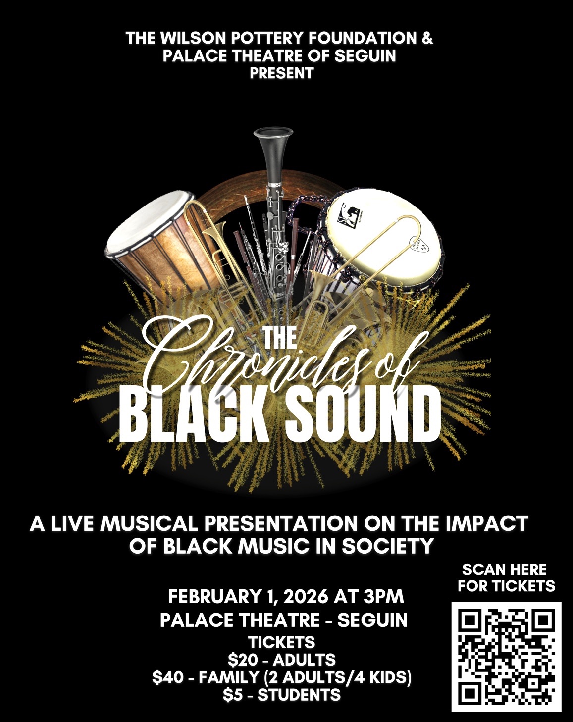 You are invited to join Wilson Pottery Foundation as we kick off Black History Month with a vibrant celebration of and exploration of live musical and dance performances journeying through Jazz, Blues, Country, Rock, Gospel and an ensemble concert of R & B performed by Music ForYa Soul. Other special guests include Act of Kindness, Seguin Community Choir, Kimbley Callis, host-Danielle King, TBow and others.
